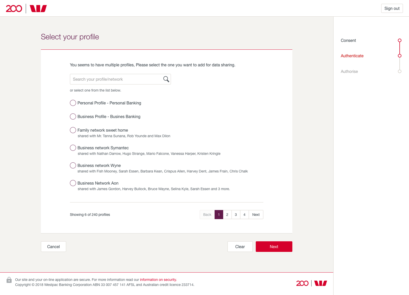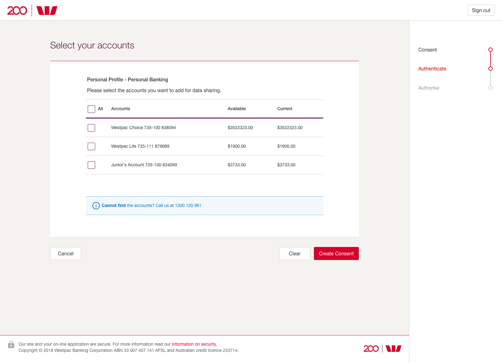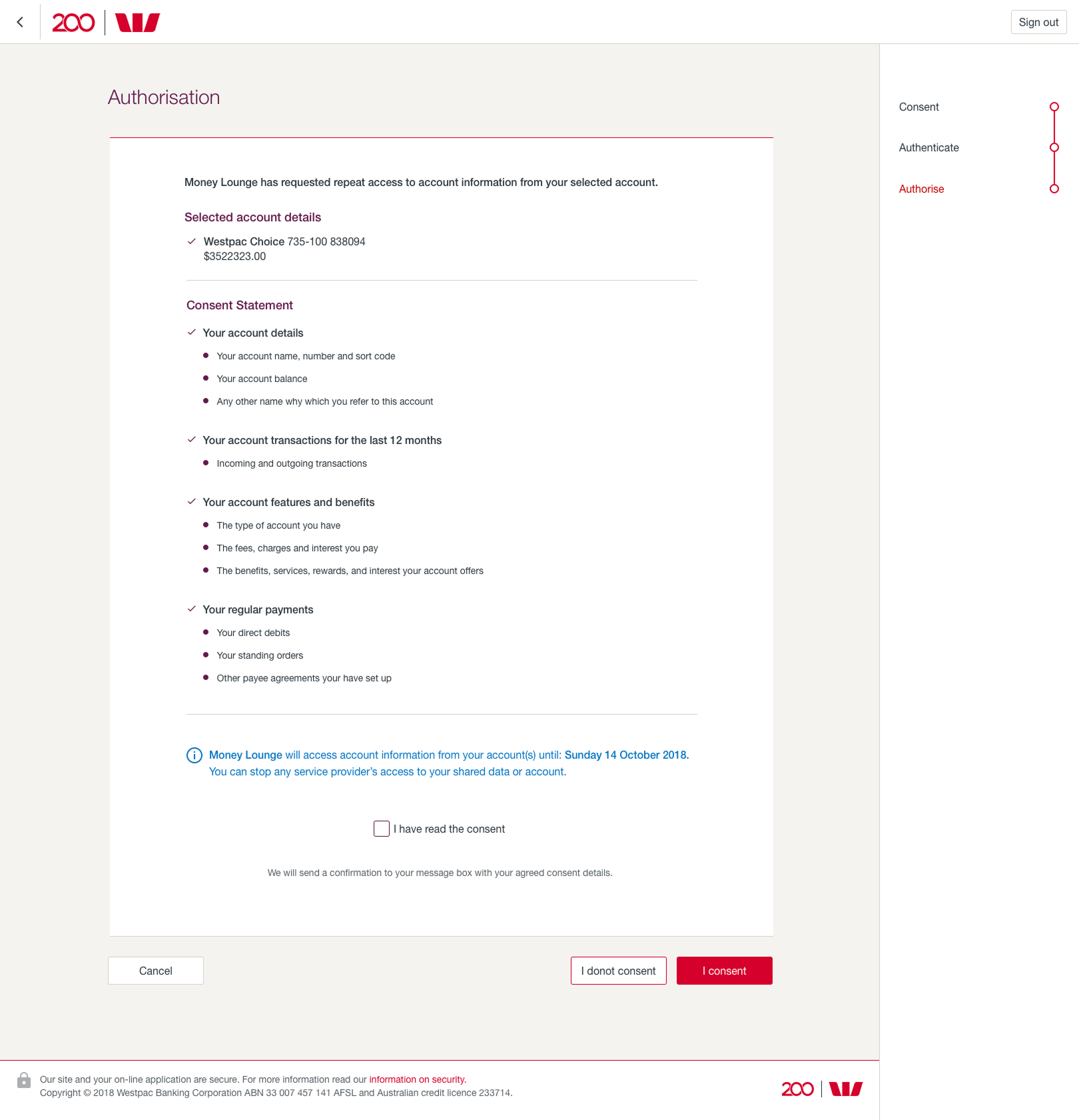 In Westpac's Open Banking journey, the initial step was consent initiation, designed for simplicity and clarity, informing customers succinctly about the process and merits of data sharing. This was followed by a critical authentication step, balancing top-tier security with user-friendliness to ensure robust protection without deterring usage. Upon successful authentication, customers were empowered to grant, manage, or revoke their consent, thus offering them transparent control over their financial data, all within a streamlined and intuitive framework.