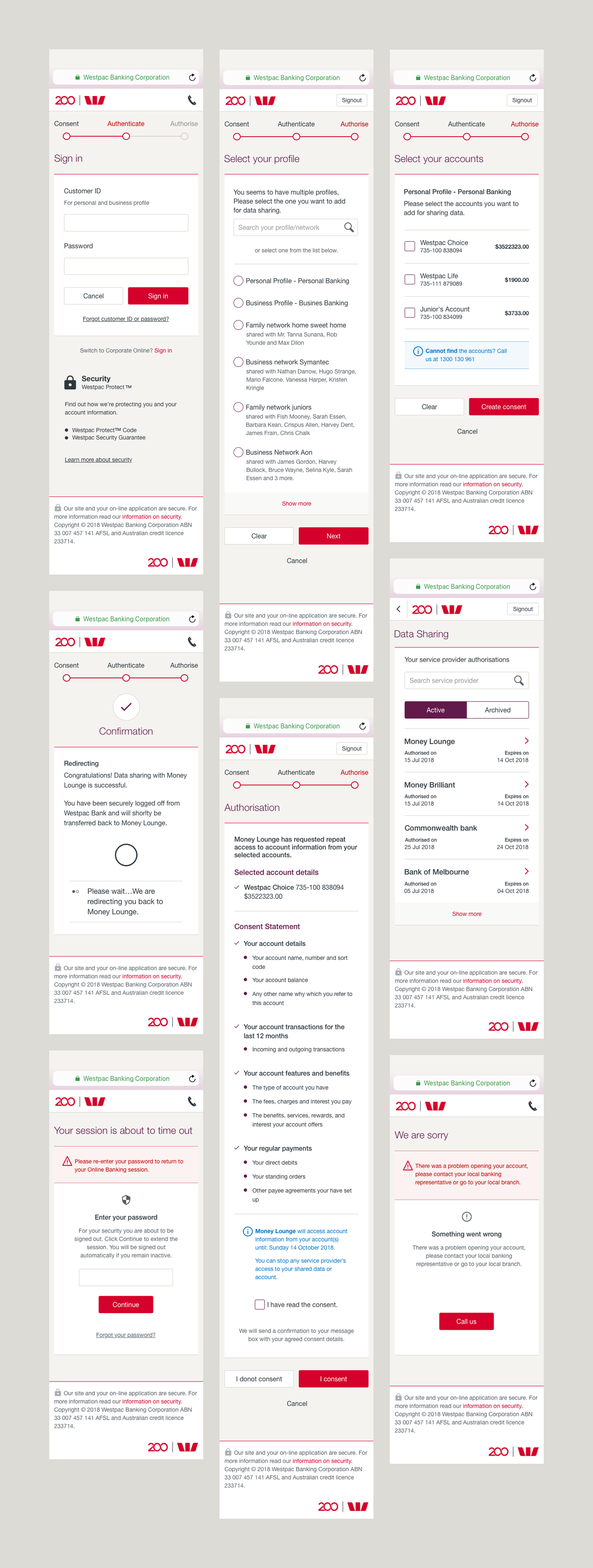 As the project progressed, these wireframes were evolved into interactive prototypes, bringing the static designs to life in accordance with GEL standards. These prototypes offered a dynamic experience, allowing users to interact with the dashboard, navigate through the consent management process, toggle data sharing preferences, and configure security settings in a simulated environment. This interactive phase was crucial for validating the user experience, ensuring that the interface was not only functional but also resonated with Westpac's commitment to a seamless and user-centric design.